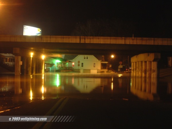 The Kanawha and Elk Rivers crest at a record height during a flood event in Charleston, West Virginia on November 20, 2003, submerging parts of Garrison Avenue. Image from 4.7MP digital camera.