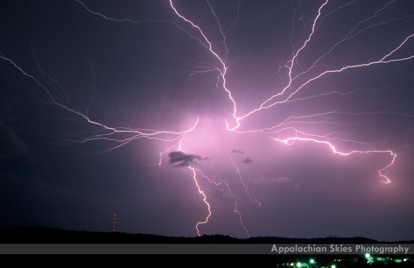 - A sky-filling lightning discharge explodes overhead near Scott Depot, West Virginia. The 35mm slide exposure of this discharge is below.