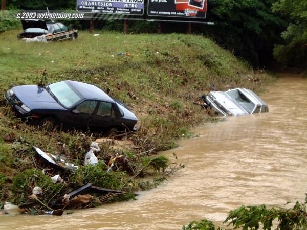 Elk Twomile Creek picked up cars like toys along Greenbrier Street in Charleston, West Virginia during the major flash floods of June 16, 2003. Image from 4.7MP digital camera.