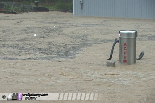 Swirling, muddy water from the flooding Mill Creek submerges a car wash vacuum along Greenbrier Street near Charleston, West Virginia during the major flash floods of June 16, 2003. Image is from video.