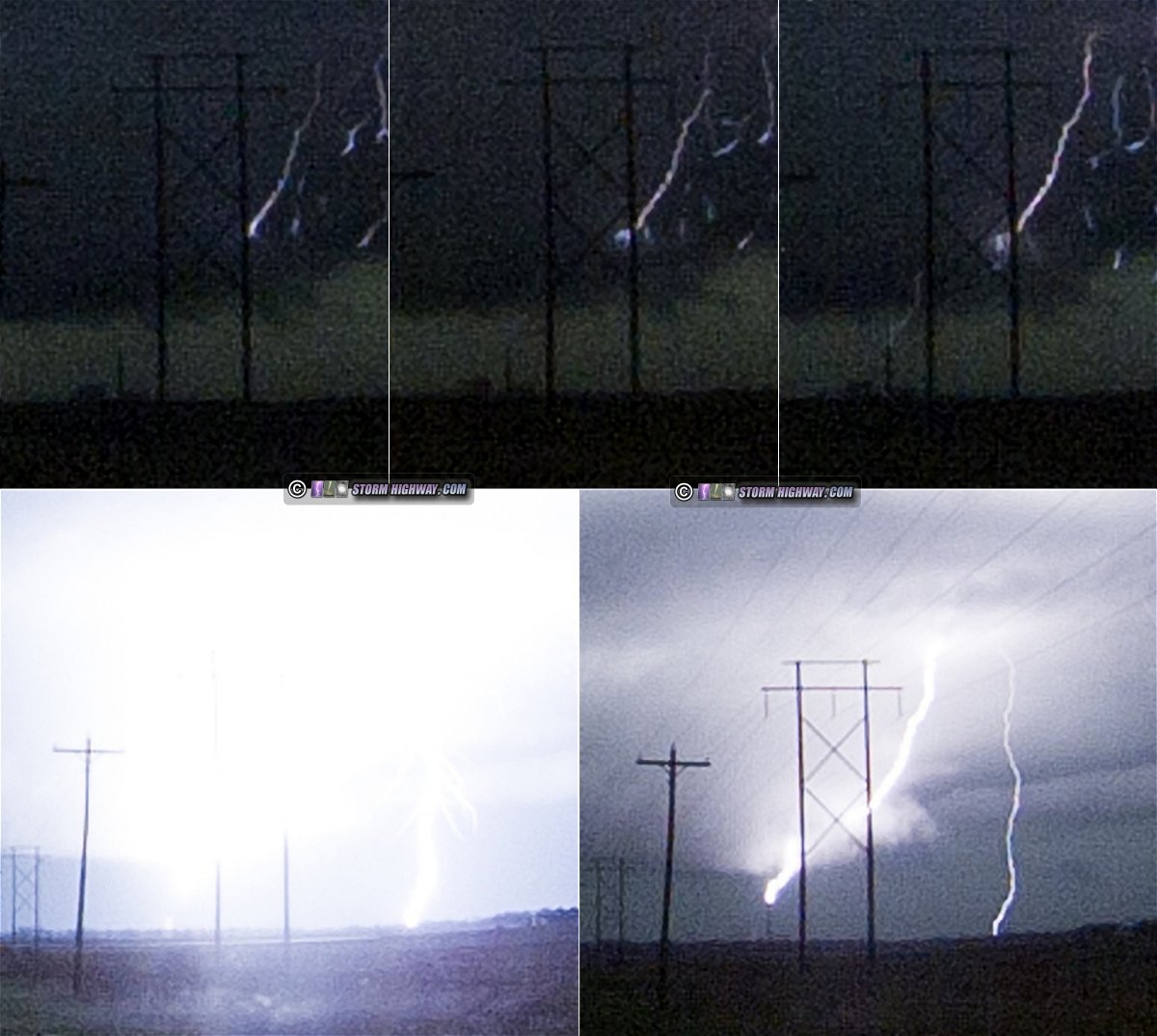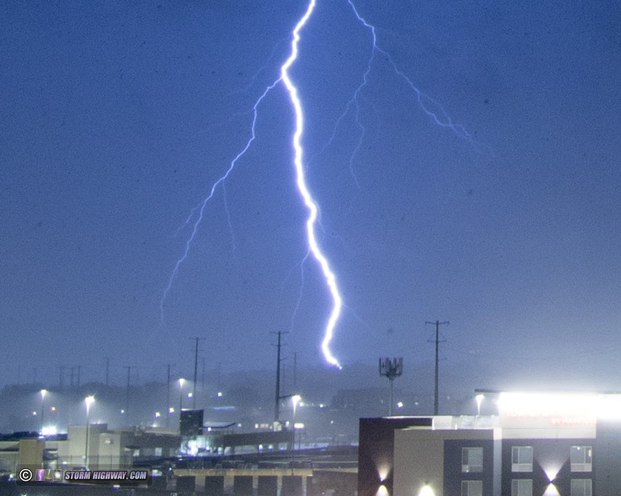 As I moved north then east to stay with this, a barrage of negative lightning began. One bolt struck a high-voltage power line a few hundred feet in front of me, producing a flashover on the adjacent low-voltage lines on the other side of the road (watch video):