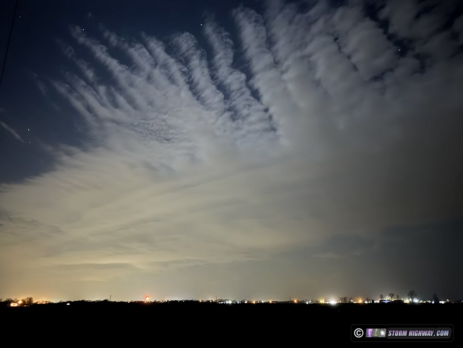 I went just outside of town to watch (and feel) the front roll through. There was a nice arcus on the leading edge, and an interesting wind shift sequence (south-southwest to west, then suddenly north). Dirt from the fields kicked up enough that it would have been a more dramatic visual had it been daytime. This was moving fast enough that the cloud features were soft on the longer exposures.