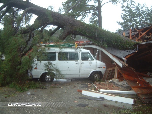 | The occupant of this apartment near Williamston, North Carolina barely escaped before Isabel blew a large tree onto the building, crushing the structure and a van parked out front.